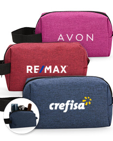 Nécessaire em Poliéster mesclado com PVC resistente à água e fechamento em zíper. Possui alça lateral em nylon para transporte e uma pequena alça para acesso de chaveiro ou gancho.