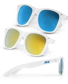 Óculos de sol em policarbonato, com armação translúcida e lentes espelhadas de categoria 3. Oferece proteção UV400, garantindo estilo e segurança contra os raios solares.