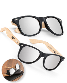 Óculos de sol com armação em PP e bambu. Lentes espelhadas de categoria 3 e UV400 de proteção. Em conformidade com as normas EN ISO 12312-1. A cor e o resultado da impressão nos materiais naturais pode variar entre produtos. 146 x 49 x 150 mm