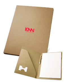 Pasta A4 confeccionada em cartão kraft 100% reciclado (450 g/m²), ideal para quem valoriza sustentabilidade sem abrir mão da praticidade. Acompanha bloco com 40 páginas lisas também recicladas, perfeito para anotações em reuniões e no dia a dia. Conta com suporte interno para cartão de visita, facilitando a organização. Inclui ainda caneta esferográfica com escrita azul, tornando o conjunto completo. Um brinde corporativo funcional, ecológico e elegante, que reforça o compromisso com o meio ambiente.