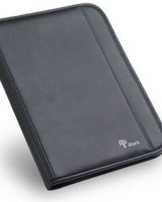 Pasta A4 de couro sintético. Acompanha calculadora dual-power, pilha e folhas pautadas. Esferográfica não inclusa. A pasta é preta com costura azul.