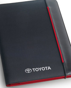 Pasta A4 de couro sintético e poliéster, interior em microfibra. Folhas pautadas. Esferográfica não inclusa.