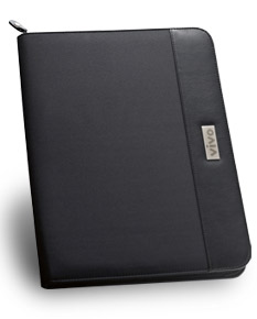 Pasta A4 com couro sintético, microfibra e folhas pautadas. Esferográfica não inclusa