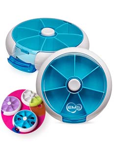 Este porta-comprimidos é uma excelente opção para deixar a rotina de cuidados com a saúde ainda mais prática. Feito em plástico, possui sete divisórias para organizar medicamentos de maneira eficiente e ágil. Com seu botão de acionamento, é possível girar um compartimento a cada clique, permitindo o acesso à medicação do dia, que pode ser retirada pela abertura lateral do porta-comprimidos. Seu tamanho compacto permite levá-lo facilmente para viagens dentro de bolsas, mochilas ou malas.