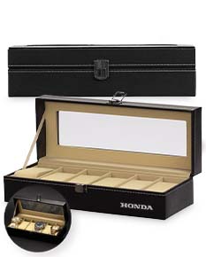 Porta-relógios com acabamento em couro sintético e interior revestido em veludo. Possui seis divisórias com almofadas removíveis, tampa com visor em acrílico e abertura em 90 graus, facilitando a visualização e o manuseio dos acessórios. Conta com trava de segurança para fechamento do estojo.