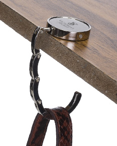 Porta bolsa de metal dobrável, possui chapa central redonda para gravação e parte traseira borracha anti deslizante. Para utilizar o porta bolsa basta puxar a lateral(é imantado) e abri-lo. (NÃO ACOMPANHA CAIXINHA)