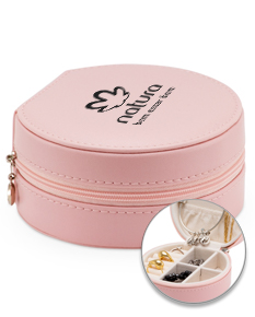 Porta joias de couro sintético com revestimento aveludado. Possui compartimentos internos para anéis, brincos, pulseiras e colares.
