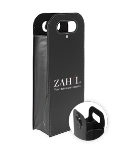 Porta vinhos duplo em couro sintético com estrutura interna em papelão, ideal para transportar garrafas com segurança e elegância. Possui alça de mão vazada, fechamento em botão metálico e divisória removível que facilita a organização. Um brinde corporativo sofisticado, perfeito para valorizar presentes e ocasiões especiais.