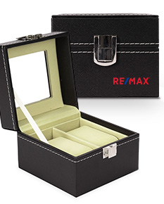 Porta-relógios com acabamento externo em couro sintético à base de PVC e interior revestido em veludo. Possui duas divisórias com almofadas removíveis, tampa com visor de vidro e trava de segurança para fechamento, ideal para armazenar e proteger os relógios com elegância.