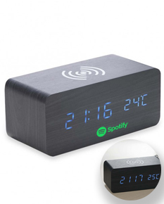 Relógio digital LED com alarme e carregamento por indução, pode ser utilizado através da fonte USB (acompanha) ou 3 pilhas AAA (não acompanha). Produzido em MDF, o relógio possui um display LED na parte frontal, área para carregamento via indução na parte superior, parte traseira com mecanismo para ajustes, entrada DC 5V e compartimento de pilhas.