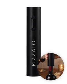 Saca rolhas elétrico recarregável com estrutura em plástico ABS, policarbonato (PC) e broca em aço carbono. Conta com botões em formato de diamante para controle do aparelho e acompanha cabo USB-C para carregamento.
