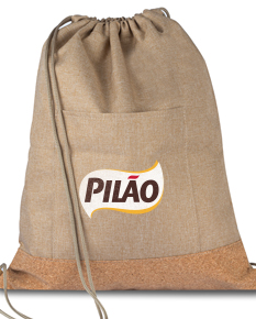 Bolsa em poliéster 600D com detalhe em cortiça, alça dupla para colocar nas costas e bolso frontal.