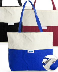 Sacola confeccionada em lona 356g/m² com revestimento interno em poliéster, bolso frontal aberto e duas alças com costura interna.