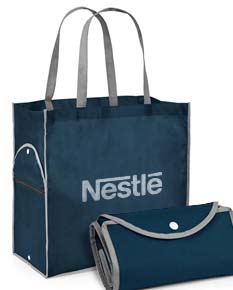 Sacola dobrável. Non-woven: 80 g/m². Alças de 65 cm. Dobrado: 200 x 120 mm| Aberto: 400 x 450 x 200 mm.