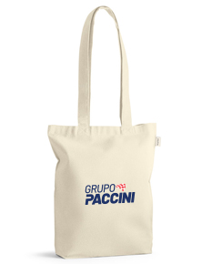 Sacola feita de 100% algodão reciclado (140 g/m²) com alças de 75 cm de comprimento. Dimensões: 380 x 420 x 100 mm. Ideal para uso diário, oferecendo durabilidade e sustentabilidade em um design funcional.