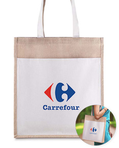 Sacola ecológica em juta 360g/m² com bolso frontal e alças em algodão cru. Base reforçada e acabamento rústico para brindes sustentáveis e versáteis.