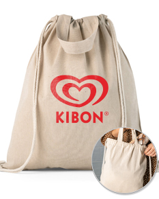 Sacola tipo mochila com algodão reciclado (140 g/m²), alças de 30 cm e cordões em algodão para fechar