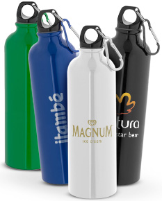 Squeeze esportiva em aço inox de parede simples. A tampa tem um mosquetão que facilita seu transporte ou pode ser pendurado numa mochila. Capacidade até 820 mL. Caixa branca 94657 vendida opcionalmente. Certificação EU Food Grade.