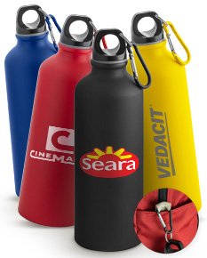 Squeeze em alumínio com acabamento mate e mosquetão para facilitar o transporte. Capacidade até 550 ml.