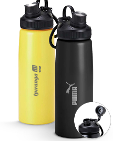 Squeeze inox 900ml com tampa plástica, bocal com tampa protetora e alça para transporte.