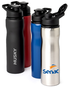 Squeeze feito em inox com 800ml. Possui tampa plástica, bocal com tampa protetora e alça para transporte. Este brinde será o parceiro de atividades físicas perfeito.