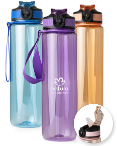 Squeeze plástico com capacidade de 1 litro, livre de BPA. Possui tampa rosqueável com bico de canudo, tampa protetora, botão de acionamento e trava de segurança. Acompanha cordão de nylon e canudo.