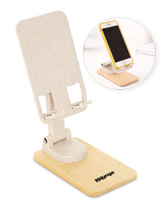 Suporte para celular retrátil feito em plástico a partir da fibra de trigo e base em bambu. Possui articulação multiangular e rotação em 360 graus, além de tiras antiderrapantes localizadas no suporte e na base. Observação: pode apresentar instabilidade a depender do ângulo de uso, é recomendável realizar um teste prévio antes do uso efetivo.