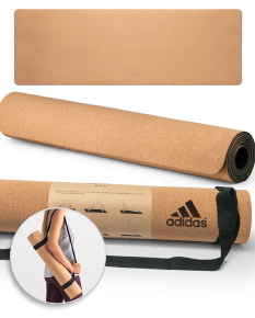 Tapete de exercício para yoga em cortiça e TPE com espessura até 3,7 mm. Inclui alça que pode ser usada para transporte ou para utilizar no exercício físico. Invólucro papel ilustrativo de exercícios que pode realizar com o tapete. Fechado: Ø100 x 610 mm | Aberto: 1830 x 610 x 3,7 mm