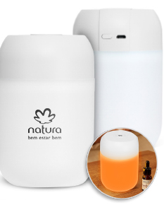 Umidificador de ar com LED, possui reservatório de água com capacidade de 350ml, dois níveis de névoa, contínua e com oscilação. Acompanha filtro de algodão e cabo USB V8.