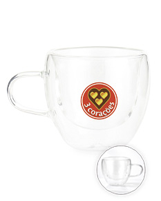 Xícara em vidro borossilicato com capacidade de até 70ml e estrutura de parede dupla, que ajuda a reduzir a transferência de calor para a parte externa. Leve e resistente, possui design moderno que valoriza a apresentação, sendo uma opção elegante e funcional para brindes corporativos.